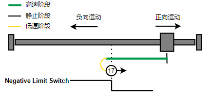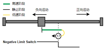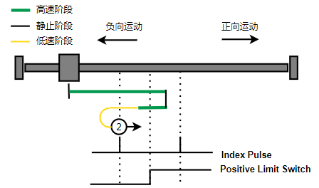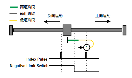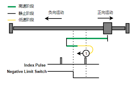 1. 如果负限位没有触发,则往负向运动,触发到限位后反向运动,直到离开负限位后,第一个Index的位置就是零位(图示中负限位为高电平触发)。