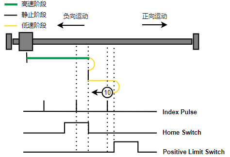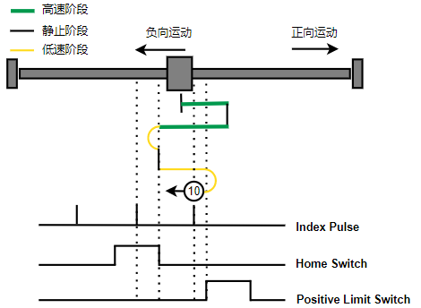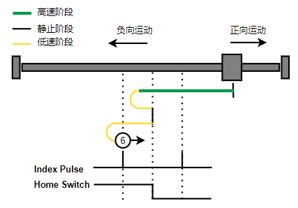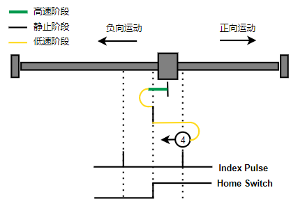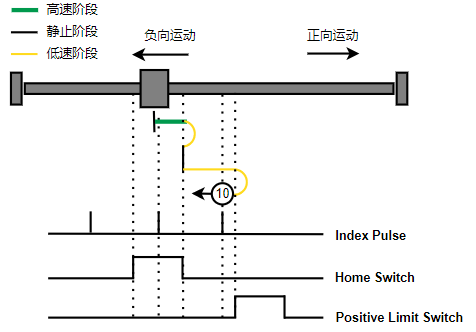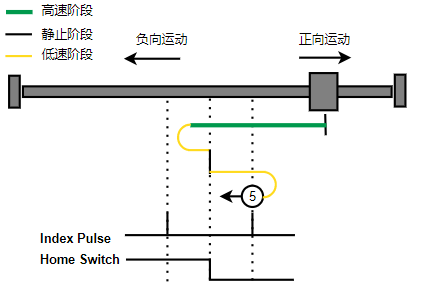 2. Home触发时,负向运动,Home左侧边沿触发后运动到触发位置,再向正向运动,碰到的第一个index信号为零点。
