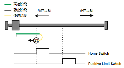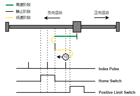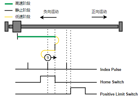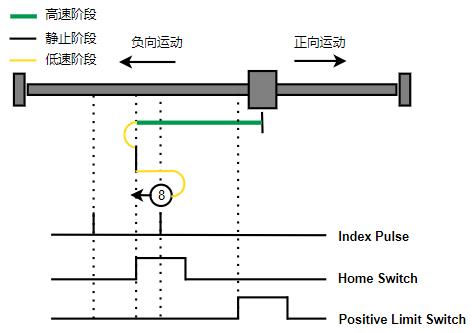 1. Home未触发时,正向运动,Home左侧边沿触发后运动到触发位置,再向负向运动,碰到的第一个Index信号为零点。