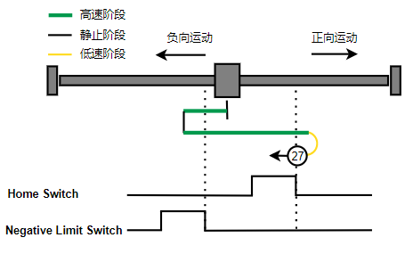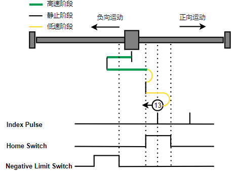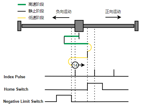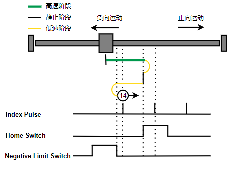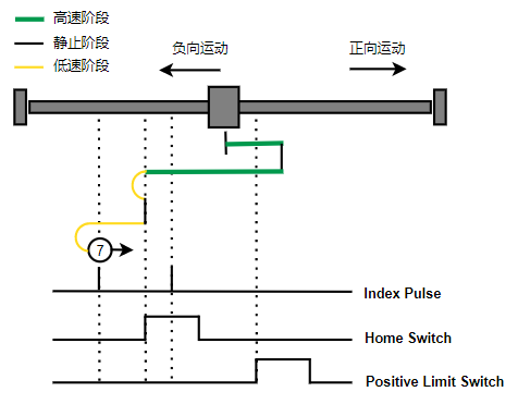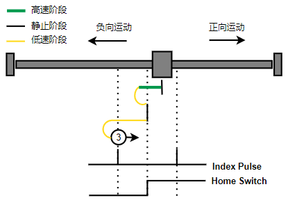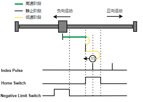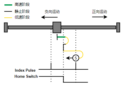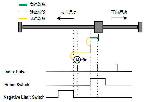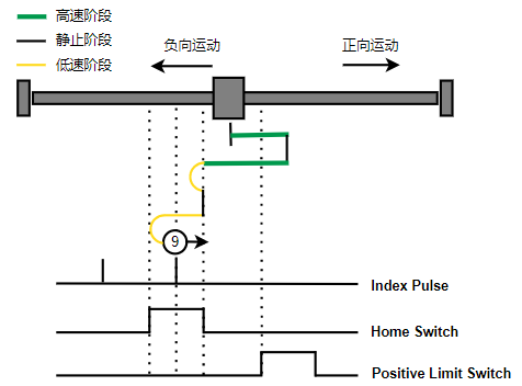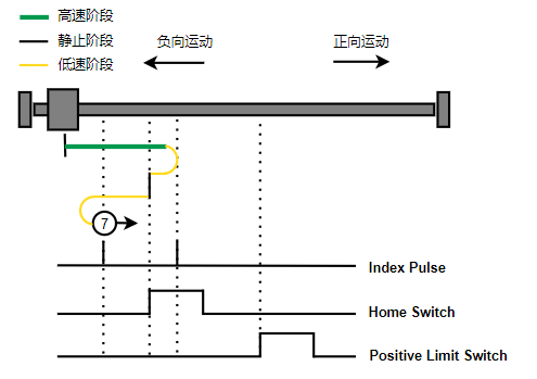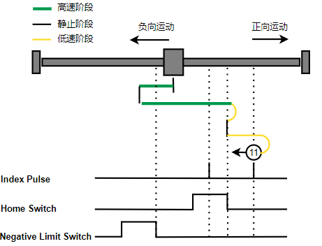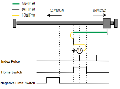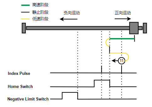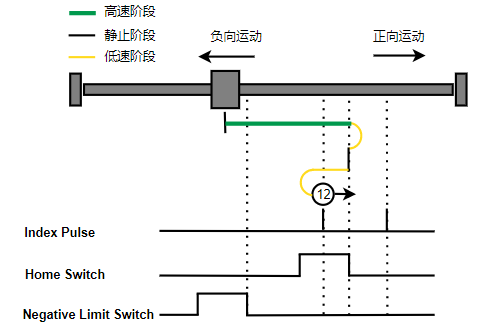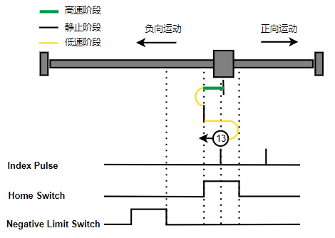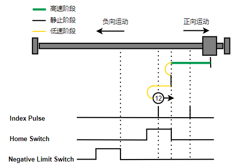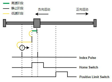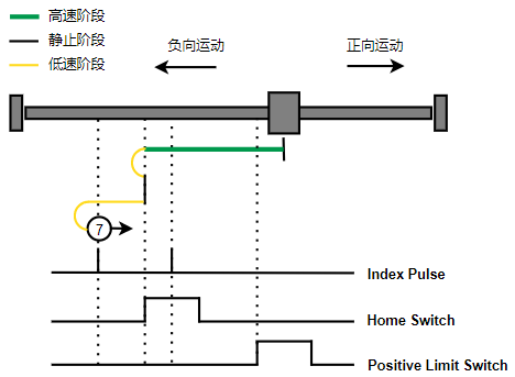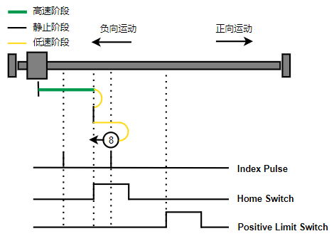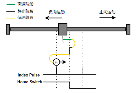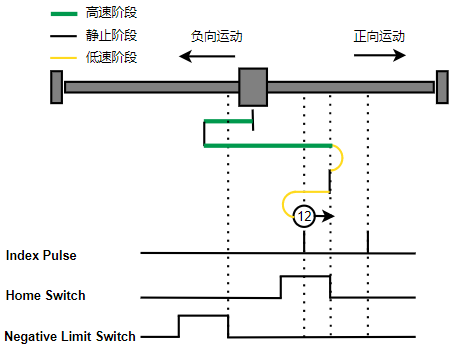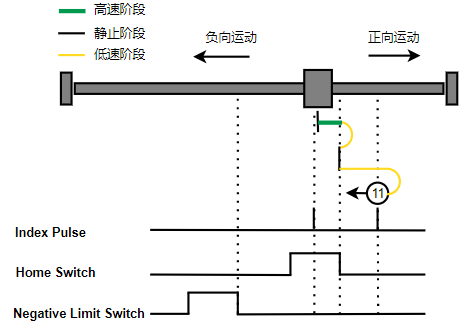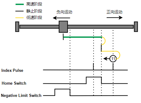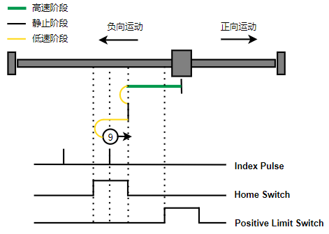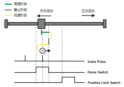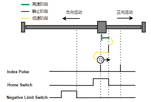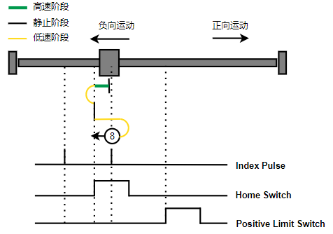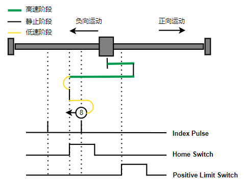 1. Home未触发时,负向运动,Home右侧边沿触发后运动到触发位置,再向负向运动,碰到的第一个Index信号为零点。