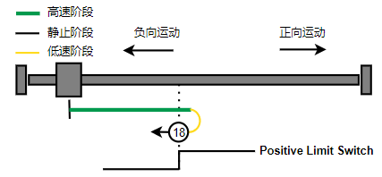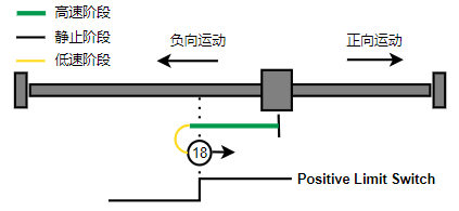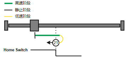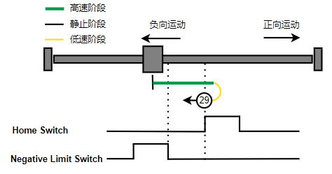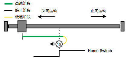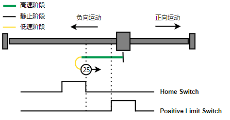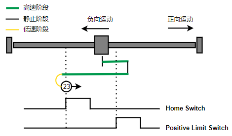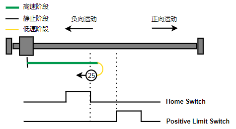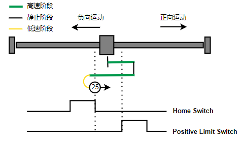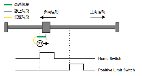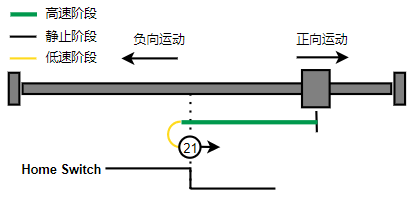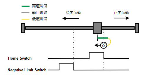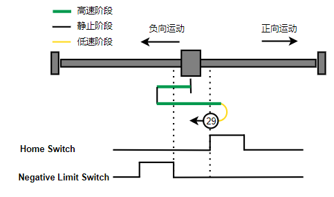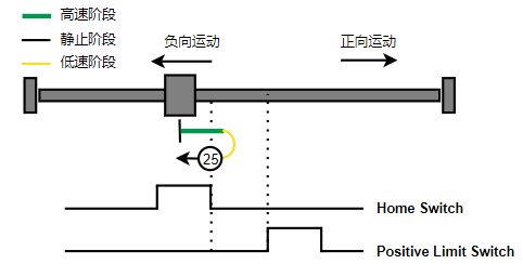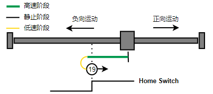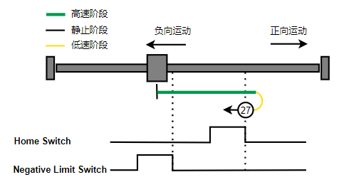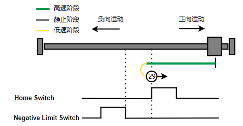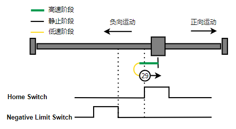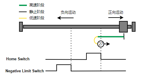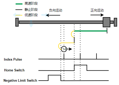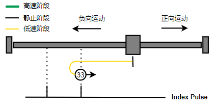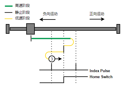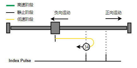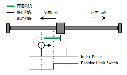 2. 如果刚开始就处于Home开关上,则往负向运动,Home左侧边沿触发后运动到触发位置,再向负向运动,碰到的第一个Index信号为零点。