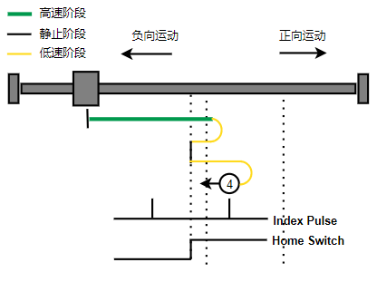 4. Home未触发,正限位触发,轴负向运动,Home右侧边沿触发后回到触发位置后负向运动,Home右侧边沿的的左侧的第一个Index信号为零点。