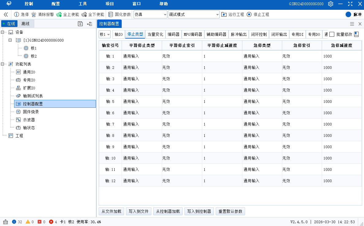 9. 上述回零方式中,触发反向或停止时所使用的减速度为通过规划器设置的轴急停减速度,用户可以通过MotionStudio的“控制器配置”页的“停止类型”项设置并保存成配置文件,调用GTN_LoadConfig下载配置文件使之生效,或在程序里面直接调用GTN_SetStopDec指令来设置。