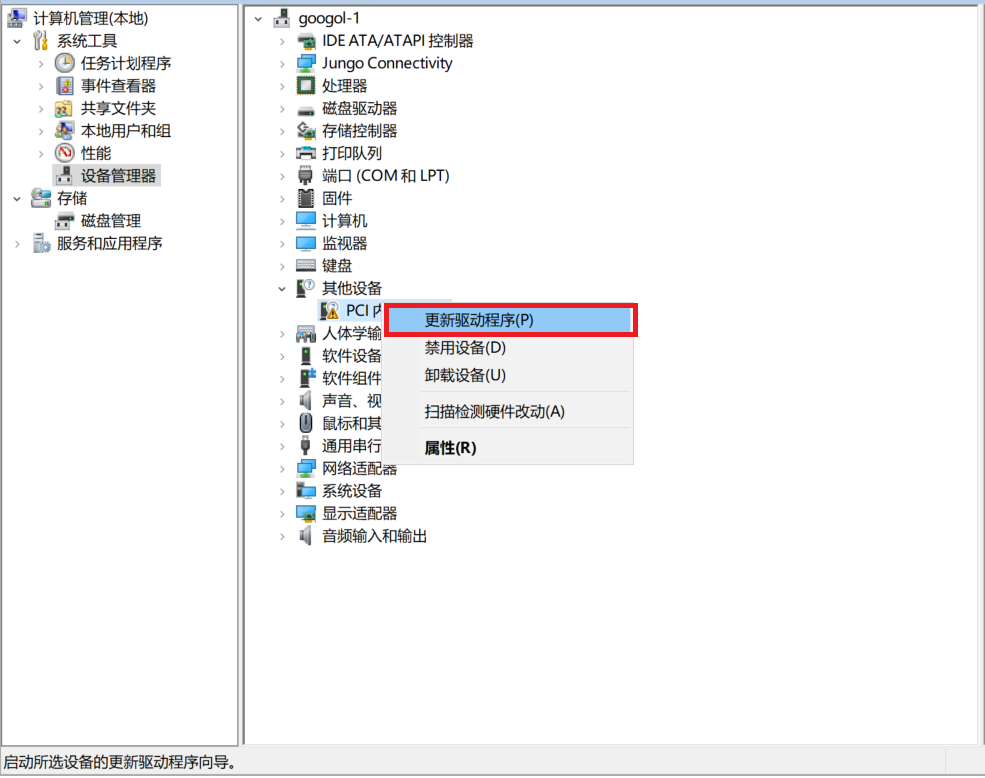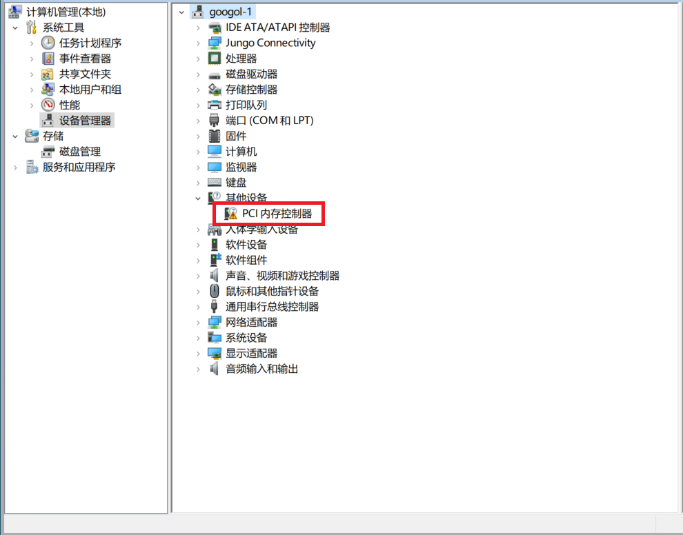 2. 登陆官网下载驱动程序,并将驱动程序拷贝到C:\中为例进行说明。如图所示,选中“PCI内存控制器”,点击鼠标右键。点击“更新驱动程序软件(P)…”。