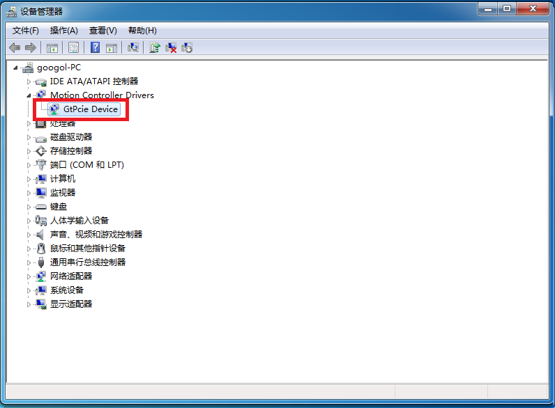 1. 在关闭计算机电源的情况下,将插卡式控制器正确插入空闲的PCI/PCIe卡槽。启动计算机后,Windows将自动检测到运动控制器,打开“设备管理器”,如图所示。