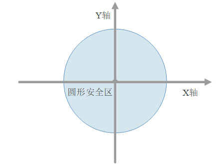 圆形安全区可以由任意两个轴组成,并且允许轴不在坐标系中。如图所示:X轴、Y轴使能了圆形安全区,则X轴、Y轴只能在圆形安全区内运动。轴位置超过安全区后以“紧急停止减速度”停止,不会准确停止到边界上。