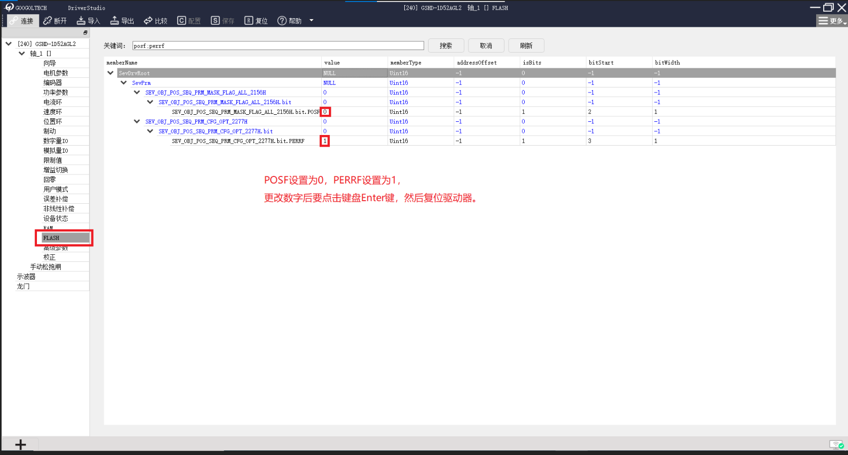 (1) gLink-II驱动器模块需要通过DriverStudio设置相应的参数,如图所示。具体操作请咨询我司技术支持工程师。DriverStudio调试软件修改参数 (2) GTN_GetAxisError读取的是驱动器计算的误差。