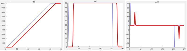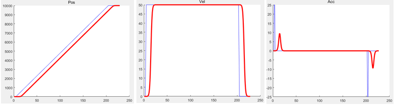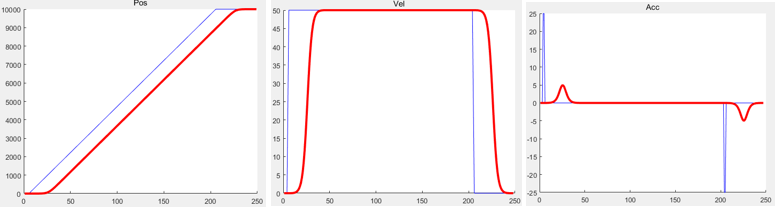 假设轴1进行点位运动,目标位置为10000脉冲,速度是100脉冲/毫秒,加速度是100脉冲/毫秒的平方,使能轴平滑功能。设置time,k,则平滑前和平滑后的位置、速度、加速度图像如下所示,其中,X轴单位为中断周期,对应位置、速度、加速度图,Y轴单位分别为脉冲、脉冲/中断周期、脉冲/中断周期的平方。蓝色细实线为平滑前的运动曲线、红色粗实线为平滑后的运动曲线。从图中可以看出,当平滑时间越大或者平滑系数越小时,速度加速度越平滑。