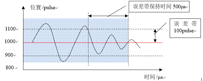 如图所示。当轴1启动电机到位检测功能,设置误差带为100pulse,误差带保持时间为500μs,当电机在1000pulse位置处静止时,会有震荡。控制器判断其震荡位于误差带内500μs后,就将GTN_GetStsEx轴状态的bit11电机到位标志置1。蓝色阴影区域表示电机到位标志还未置1,无阴影区域表示已置1。可以看出,误差带保持时间越短,误差带越大,控制器会在越短时间内将电机到位标志置1,但是并不是越短越好。电机是否连接机械本体,也会影响控制器判断电机到位所需的时间。