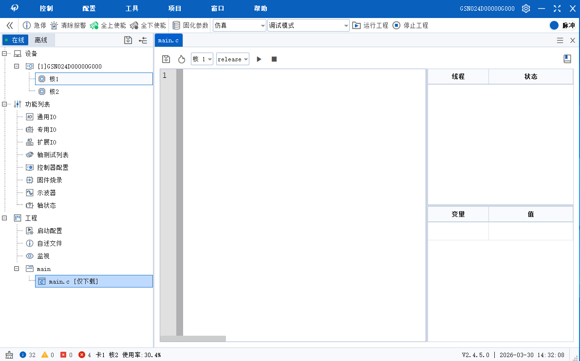 编译成功后,用户需要在应用程序中调用GTN_Download指令将目标文件(*.bin)下载到运动控制器的内存中。用户应保证目标文件和符号文件与应用程序在同一目录下。