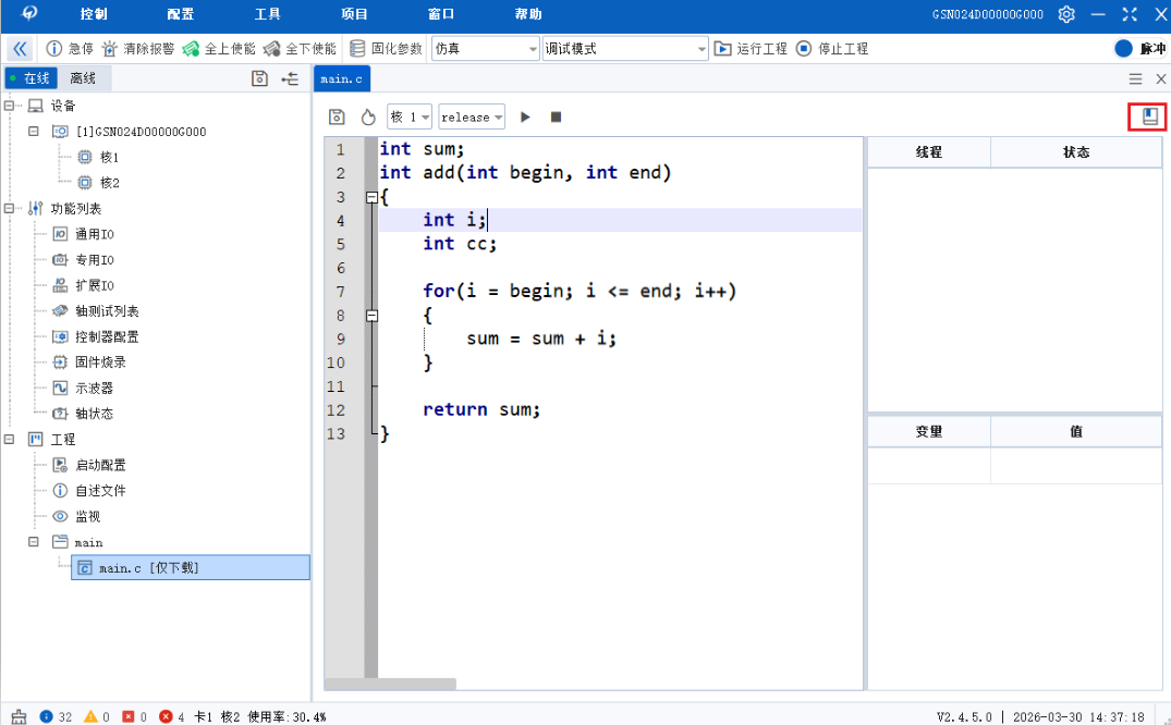 想要将编译后的运动程序下载到控制器中,需在应用程序中调用GTN_Download指令,应用程序负责下载、初始化、启动运动程序。与“单线程累加求和”不同之处在于启动2个线程完成累加运算任务。