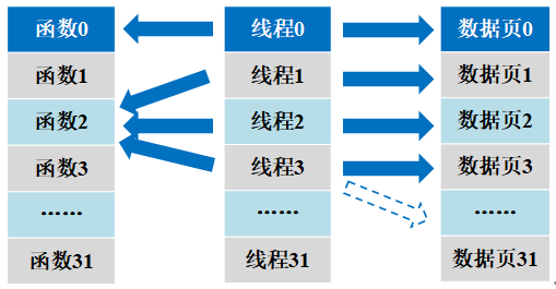 各函数的局部变量放在相互独立的数据页中。运动控制器提供32个数据页。在绑定线程和函数时,必须指明所使用的数据页。一个数据页只能分配给一个线程,但是一个线程可以使用多个数据页。线程在执行过程中可以切换数据页。其关系示意如图所示。