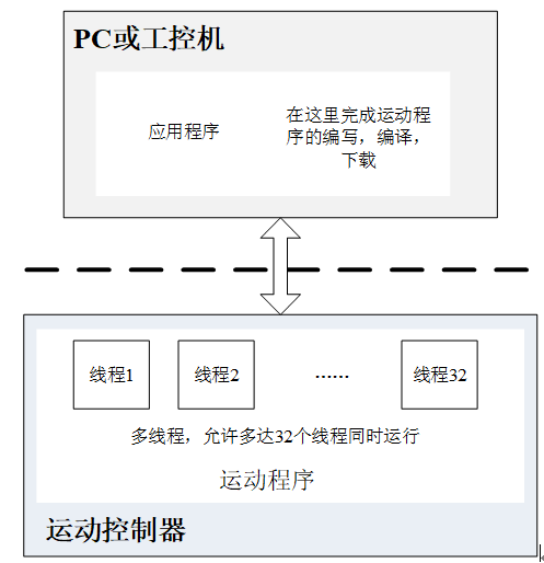 为了表述方便,直接在PC机上调用动态链接库发送指令访问控制器的程序称为“应用程序”,下载到运动控制器上执行的程序称为“运动程序”。运动程序与应用程序的关系如图所示。