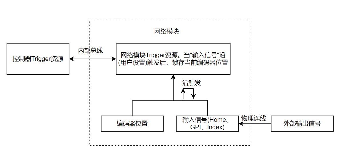 不同的捕获模式下,触发信号检测和位置锁存功能都是在网络模块上实现的,所以捕获资源(Trigger)、捕获触发源(通用输入、Index或Home)和捕获锁存位置(轴编码器或者辅助编码器)三种类型的资源必须在同一个网络型模块。