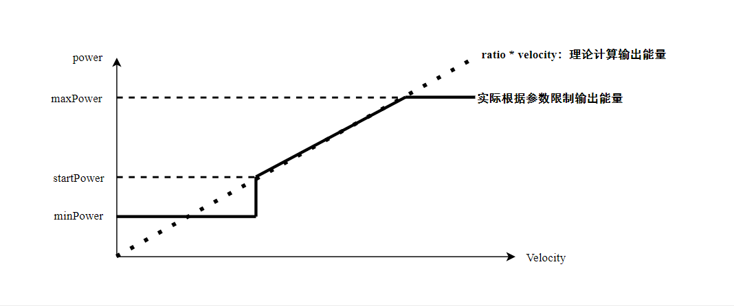 如果以频率来控制能量的变化,则频率按跟随比例与合成速度的乘积成正比,公式同上。模拟量输出模式同理。用户在应用过程中,要保证x的值不能大于maxPower(设定的最大能量值),如果x的值大于maxPower,则输出为maxPower。其输出如图表示: