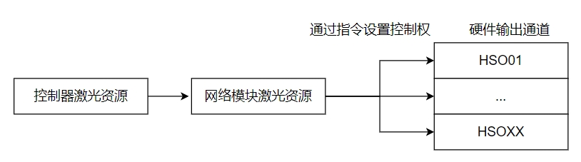 运动控制器支持激光能量输出功能,并且提供三种激光能量输出模式来控制激光输出能量大小,分别为:占空比模式、频率模式和模拟量模式。控制器和网络模块内部都有激光功能资源,两者之间的工作原理见下图。