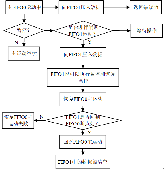 4. 当在模态点位运动的过程中,进行点位运动的轴由于触发限位等异常原因停止时,插补缓存区将不会再继续运行,此时用户需排查异常情况,重新设置相应参数,使系统正常后才可以工作。
