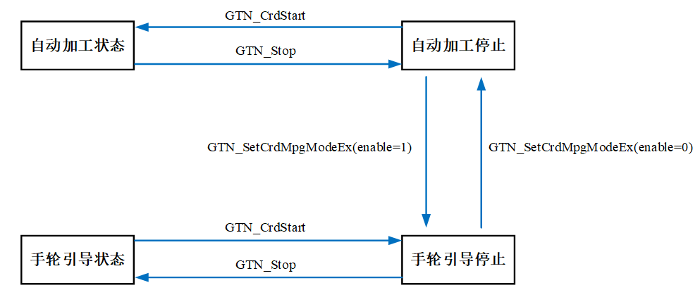 在插补处于运动停止状态时,可以通过调用GTN_SetCrdMPGModeEx进入或退出手轮引导模式,下图是自动加工与手轮引导模式相互切换的状态流程: